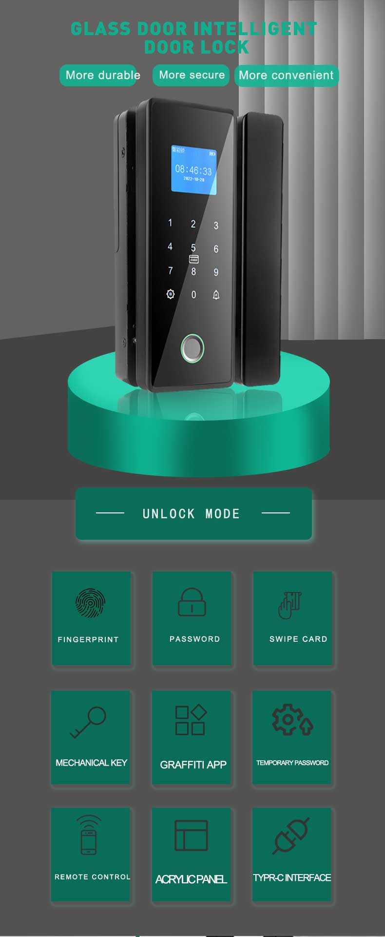Unlock method Fingerprint,password,swipe card,mechanical key,graffiti app(optional),temporary