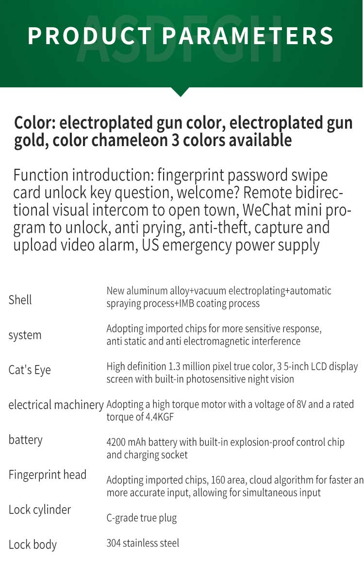 Wholesale and retail Smart Door Lock in Wollongong, Australia, with excellent quality and affordable prices.PRODUCT DESCRIPTION:SMART LOCKS MAKE LIFE MORECONVENIENT AND SECURE VIDEO CALL REMOTE INTERCOM FULLY SELF-SERVICE INTELLIGENT LOCKDOOR LOCK DETAILS PAGEFINGERPRINT UNLOCKINGMOBILE APP MANAGEMENTLOCK PRYING ALARMREMOTE MANAGEMENT OF MOBILE APPSSEMICONDUCTORFINGERPRINT RECOGNITIONRECOGNITION S..